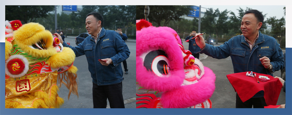 董事長(zhǎng)黎仁超給舞獅“朱砂點(diǎn)睛”,希望公司越來(lái)越繁榮、昌盛。兩頭舞獅更加生龍活虎了,時(shí)不時(shí)起舞歡騰,或踏上高柱,或吐出對(duì)聯(lián)、恭賀新年。